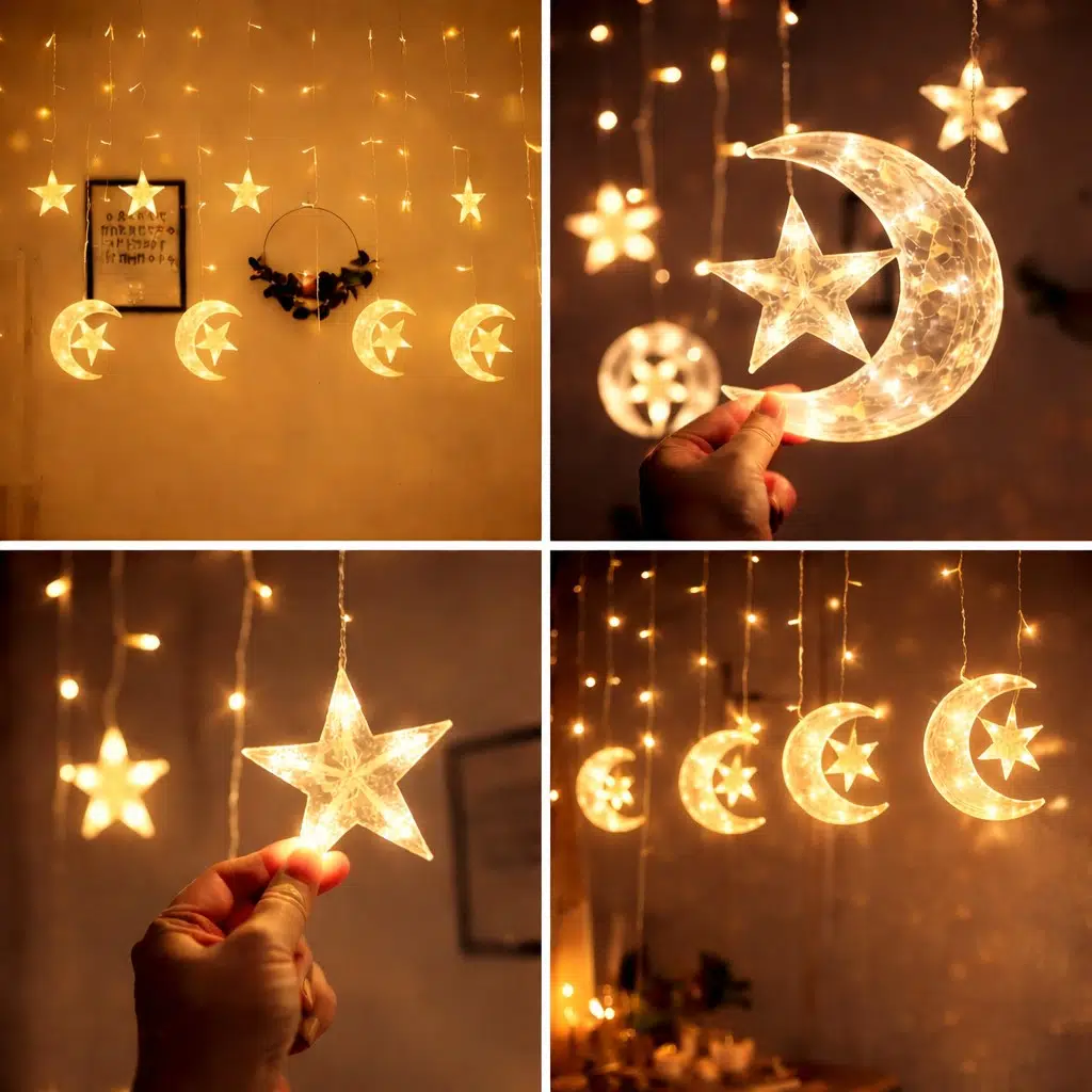 Ay ve yıldız figürleriyle tasarlanan dekoratif LED ışık, Ramazan ve özel günlerde yaşam alanlarınıza sıcak ve estetik bir atmosfer kazandırır. Ev dekorasyonunda duvar, pencere, perde ve masa süslemelerinde rahatlıkla kullanılabilir.